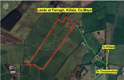 | For Sale Circa 22 Acres of Quality Agricultural Land by public auction at 4pm, Tuesday May 19th in The Merry Monk, Killala Rd, Kilmoremoy, Ballina, Co. Mayo, F26 D938 An excellent opportunity to acquire approximately 22 acres of top quality agricultural land at Farragh, Killala, County Mayo. This is some of the finest land to come to the market in the area in recent years. The lands are contained in one large, well laid out parcel with good access and mains water supply and are suitable for both grazing and silage production. Seldom does a holding of this quality come to the market in this location, making it an ideal opportunity for an existing farmer or someone looking to establish a new enterprise. Viewing is highly recommended. Sold without farm entitlements. Folio Reference: MY29423 (part of) | ||